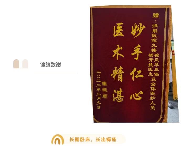 近日,我院骨科收治了一位严重褥疮患者,其深部创面约30*25cm,宛如盆口的大小。经过我院骨科专家团队多次手术和精心护理,目前,患者恢复良好。为表达感谢,家属送来了锦旗。